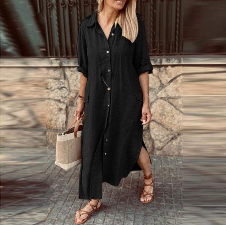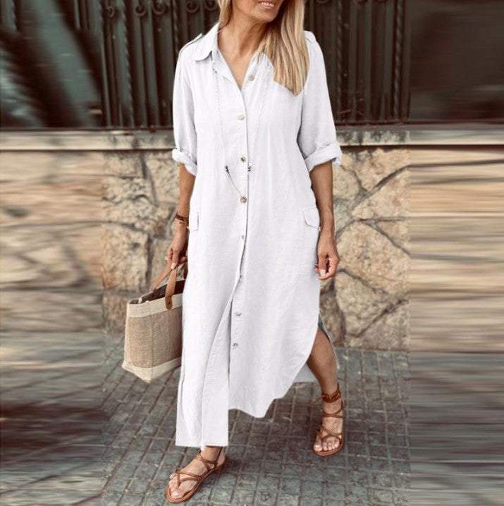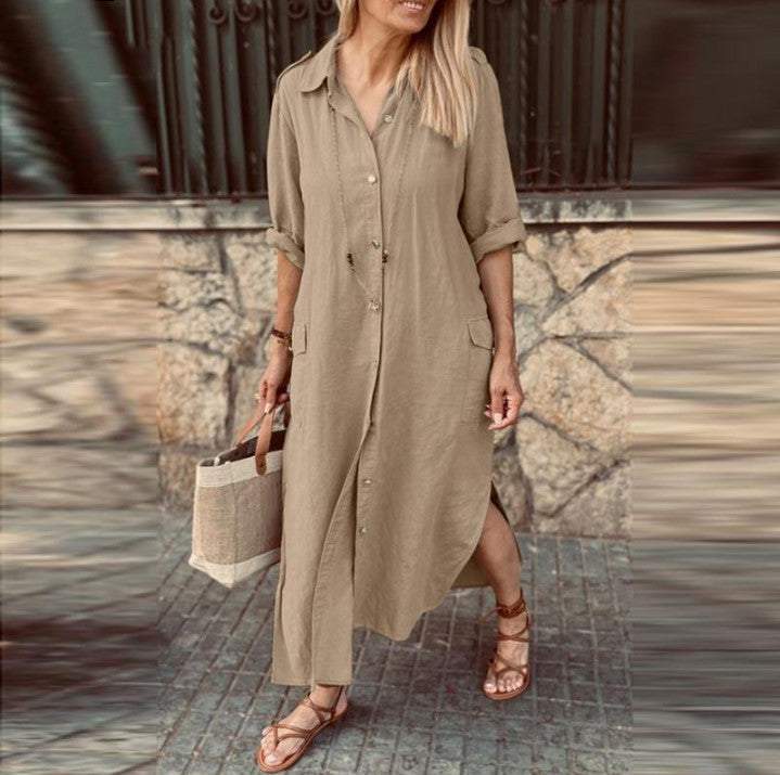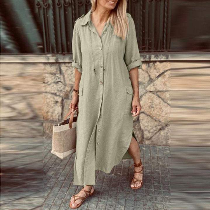 New Style Shirt Collar Cotton and Linen Button Long Dress