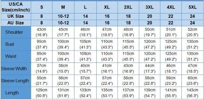 L 12-14 5'6"-5'9" (168-175cm) 160-180lbs (73-82kg) EU 44-46 / UK 16-18 Bust: 38-40in (97-102cm)
