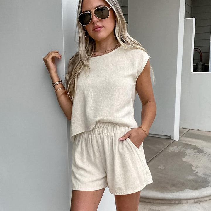Cotton and linen drop shoulder sleeveless top and shorts two-piece set