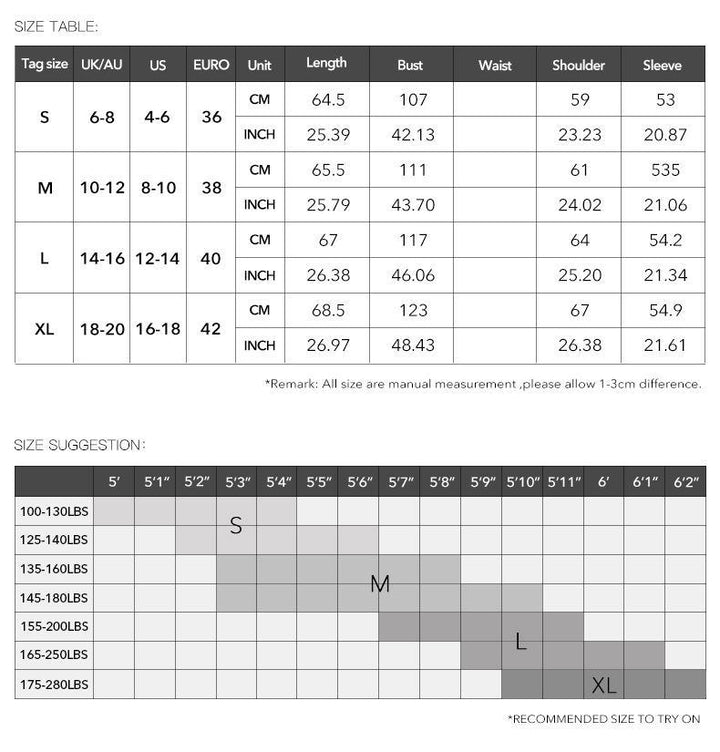 | XL | 16-18 | 5'7"-5'10" (170-178cm) | 180-200lbs (82-91kg) | EU 48-50 / UK 20-22 | Bust: 41-43in (104-109cm) Waist: 33-35in (84-89cm) Hips: 42-43in (107-109cm) |